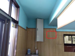 既存の分電盤の横(赤い四角)に新しい分電盤を取り付けコンセントを増設します。